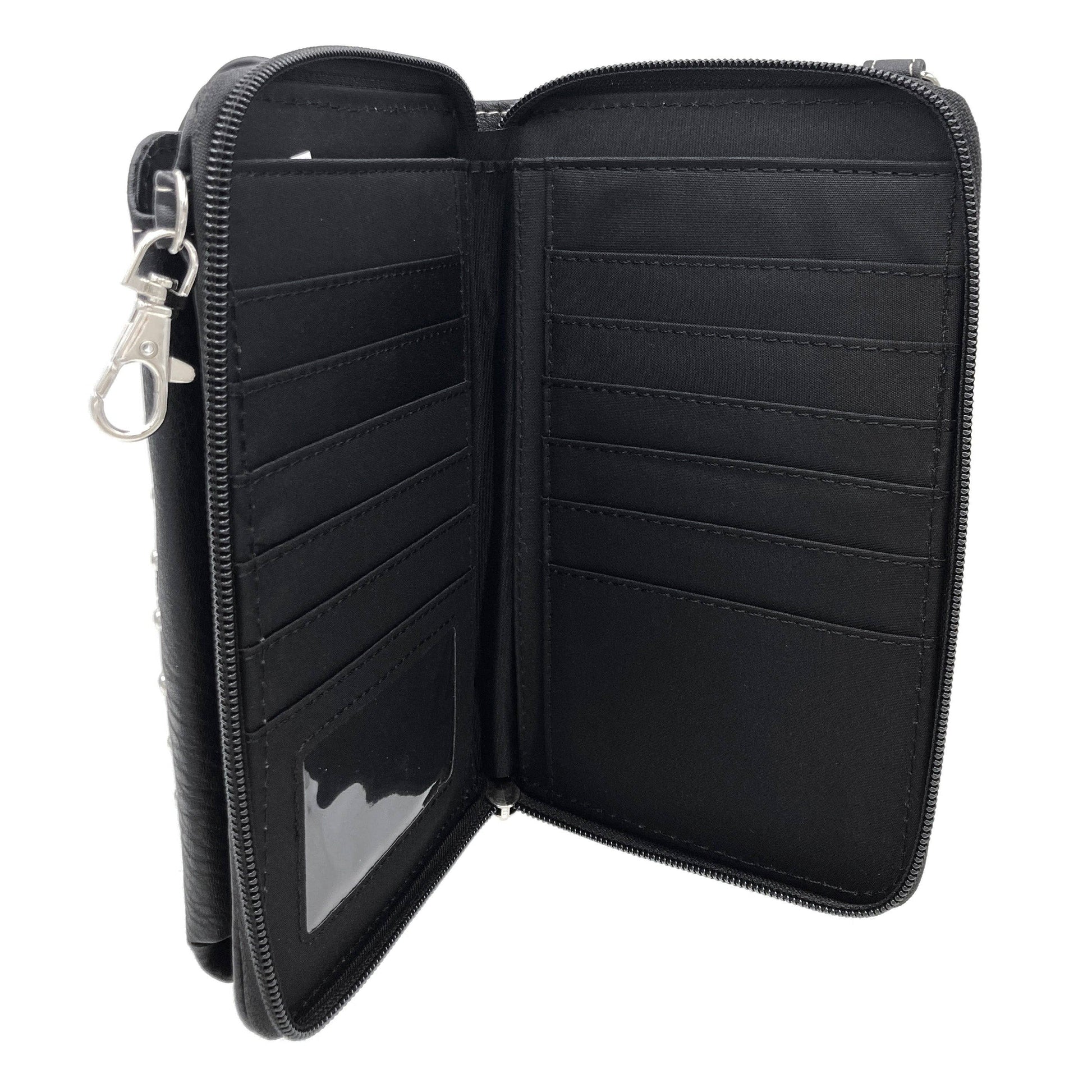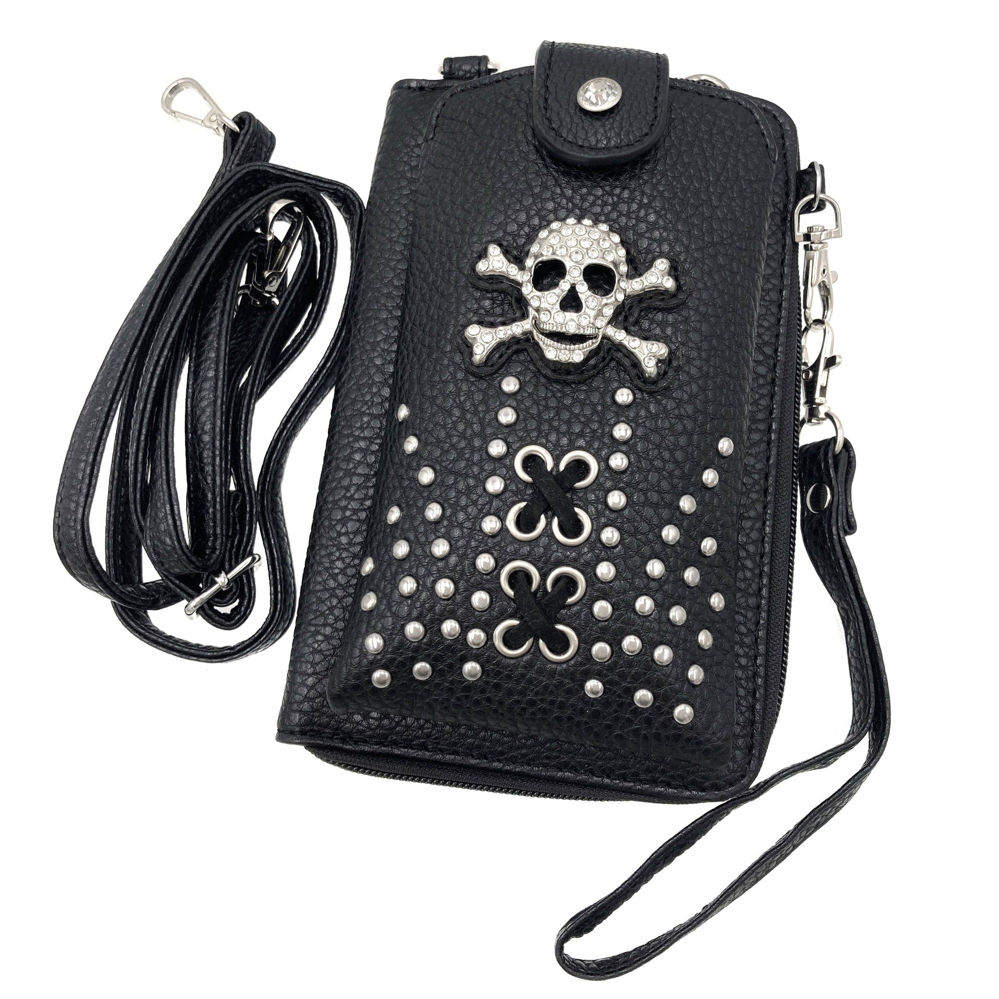 Introducing our Skull Women's Crossbody Leather Phone Wallet, measuring 8 by 5 by 2 inches and weighing 14 ounces. This stylish wallet includes an attachable wristlet strap and a long 24" crossbody strap.