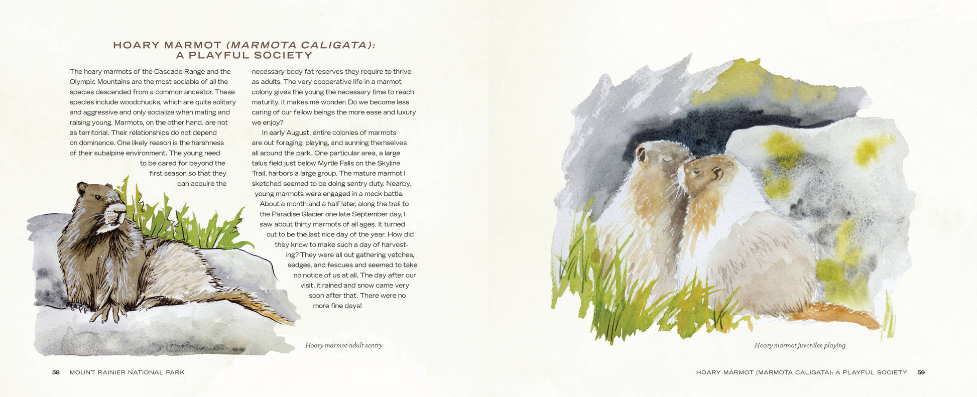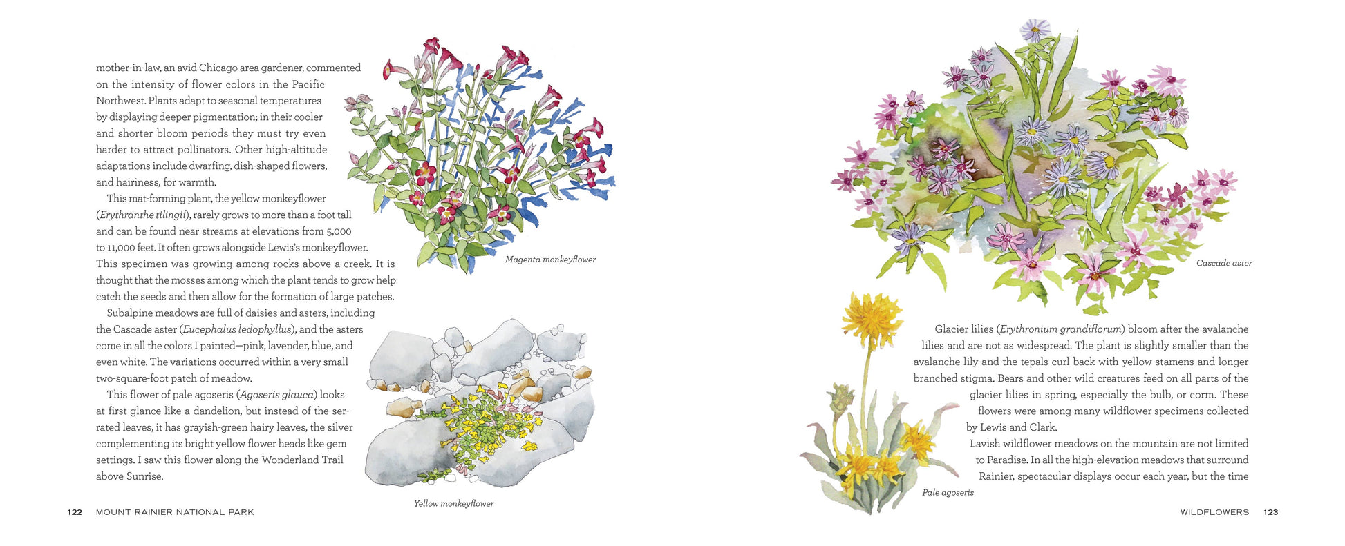 Featuring Hashimoto’s watercolor paintings and sketches, this book follows along the national park’s main road to offer an “artist’s tour.” Through evocative anecdotes, natural history, and park history, it explores the major visitor areas, natural wonders, popular landmarks, and park flora and fauna, including everyone’s favorite, marmots! Her lush palette captures Rainier through the seasons and in all its glorious details, creating a keepsake for visitors and residents alike.